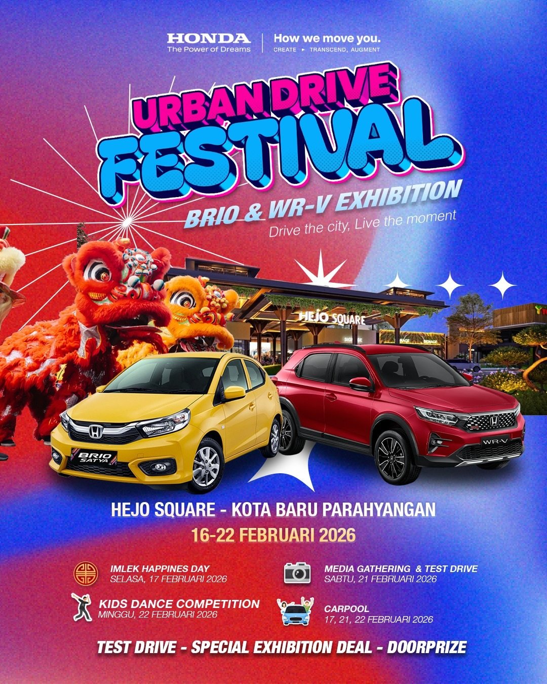 Imlek Happiness Day, Brio Car Pool Competition (17, 21–22 Februari), tantangan karaoke unik di dalam kabin Honda Brio, hingga Dance Competition (21–22 Februari).